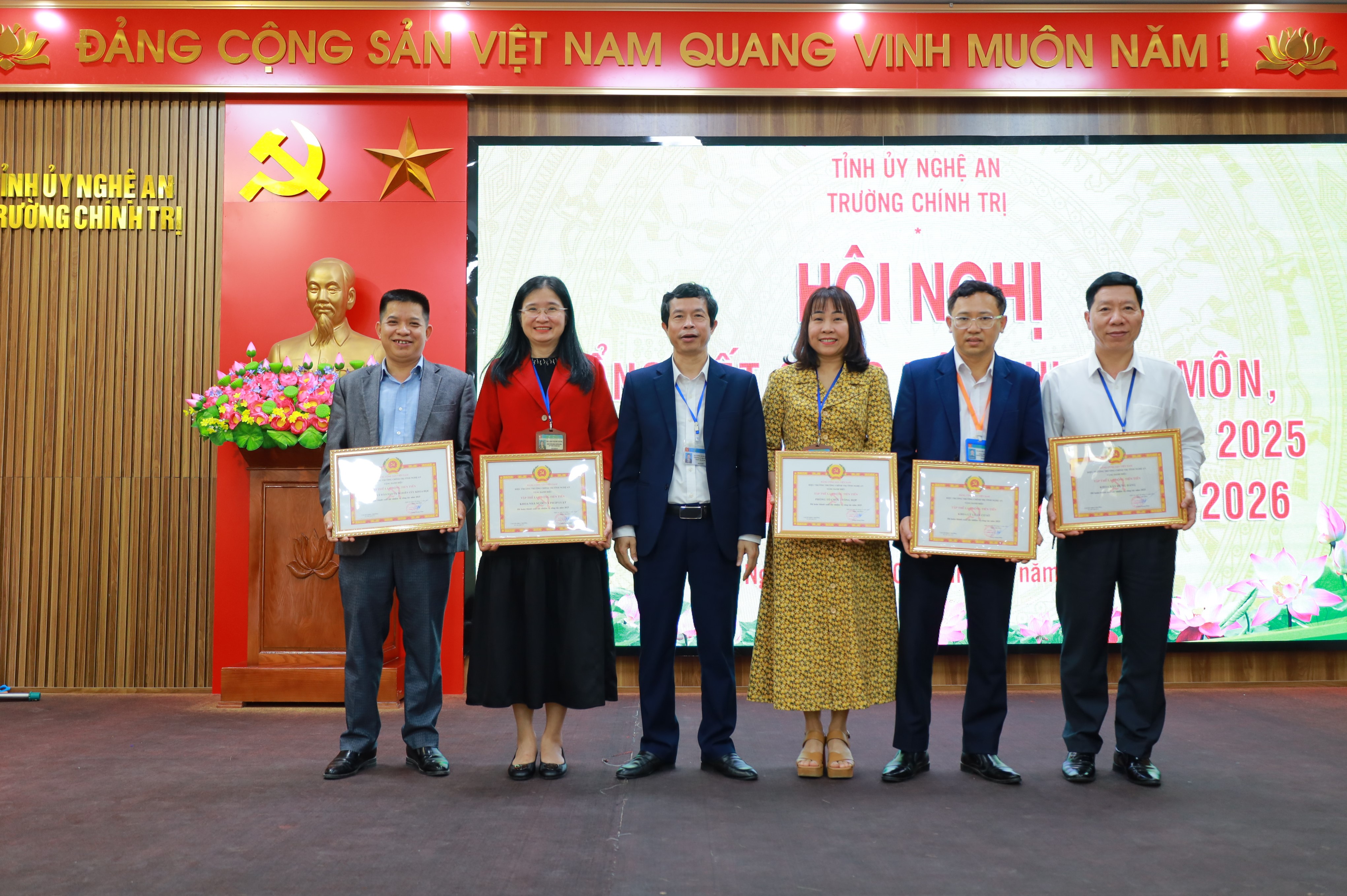Chiều 08/12, Trường Chính trị tỉnh Nghệ An tổ chức Hội nghị Tổng kết công tác chuyên môn, công tác xây dựng Đảng năm 2025 và triển khai nhiệm vụ năm 2026. Tham dự và chỉ đạo Hội nghị có đồng chí Ngô Đình Viện, Phó Bí thư Đảng ủy các cơ quan Đảng tỉnh; về phía nhà trường có các đồng chí trong Đảng ủy, Ban Giám hiệu và toàn thể viên chức nhà trường. Chủ trì Hội nghị có các đồng chí: Vương Quang Minh Tỉnh ủy viên, Bí thư Đảng ủy, Phó Hiệu trưởng; đồng chí Dương Thanh Bình – Phó Bí thư Đảng ủy...