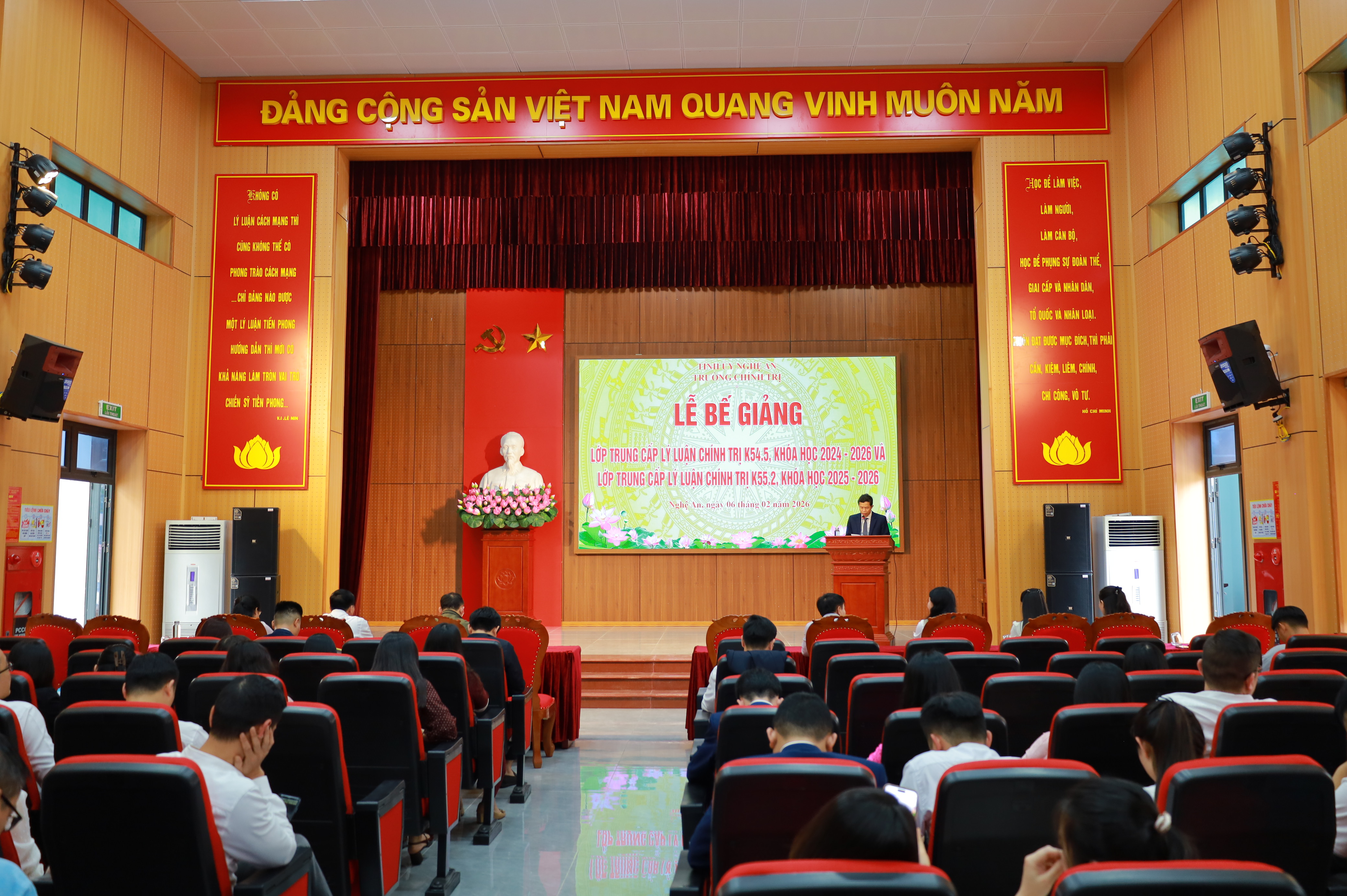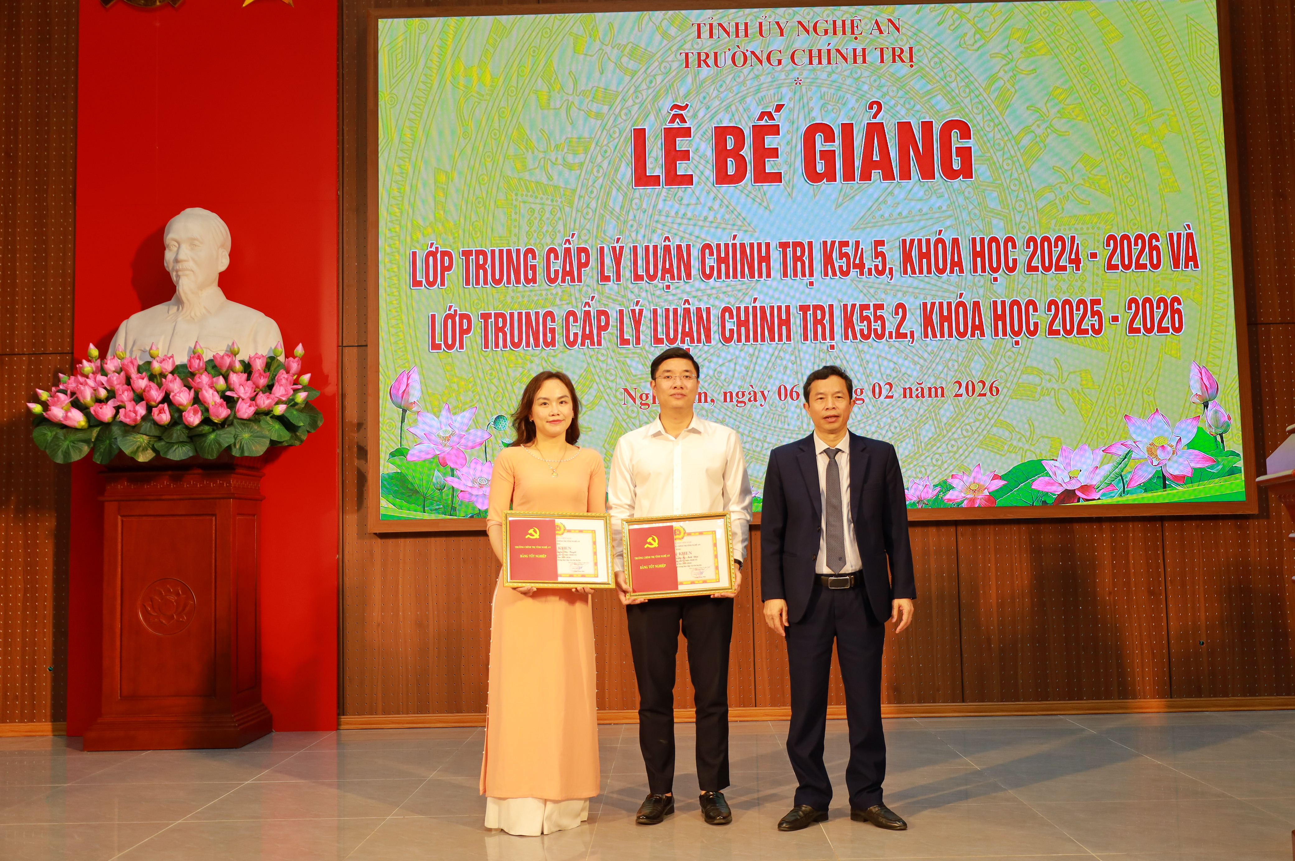 Chiều ngày 06/02/2026, Trường Chính trị tỉnh Nghệ An tổ chức Lễ bế giảng cho 2 lớp Trung cấp lý luận chính trị K54.5, hệ không tập trung, khóa học 2024-2026; K55.2, hệ tập trung, khoá học 2025-2026. Dự Lễ bế giảng có ThS. Vương Quang Minh – Tỉnh ủy viên, Bí thư Đảng uỷ, Hiệu trưởng; các đồng chí trong Ban Giám hiệu, đại diện lãnh đạo các khoa, phòng nhà trường, cùng toàn thể học viên 02 lớp.