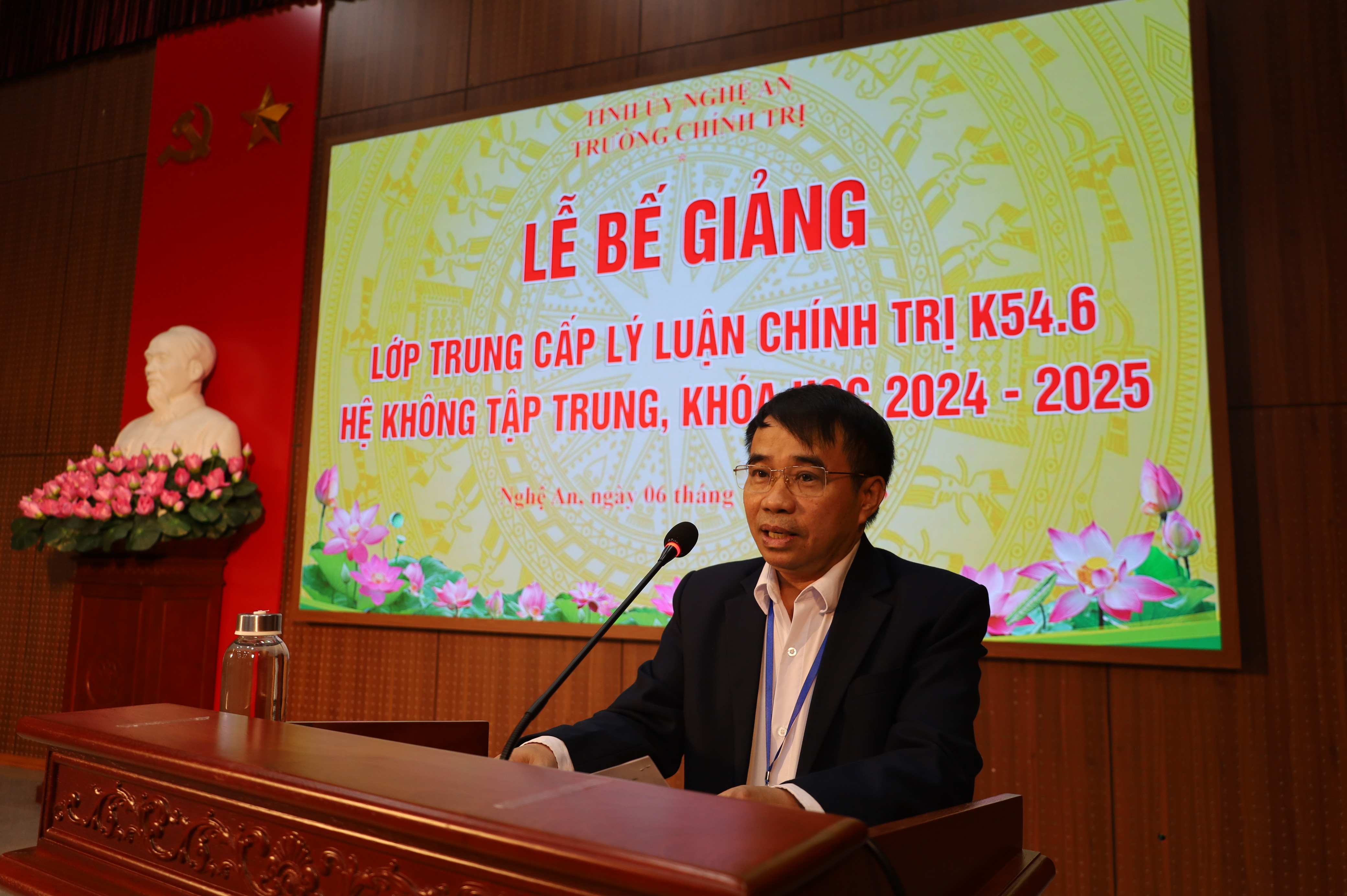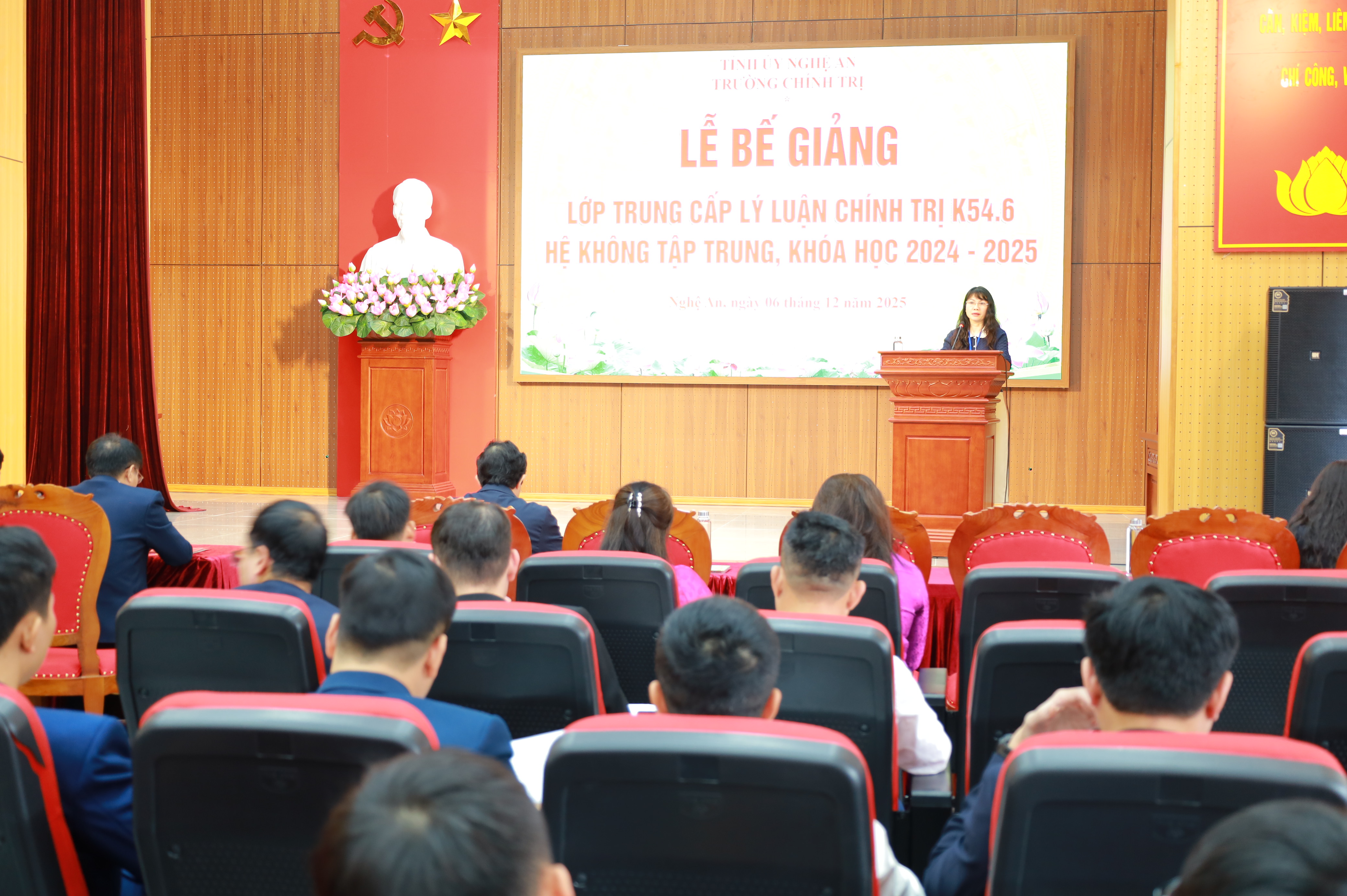 Chiều 06/12/2025, Trường Chính trị tỉnh Nghệ An tổ chức Lễ bế giảng lớp Trung cấp lý luận chính trị K54.6 hệ không tập trung (ngoài giờ hành chính), khóa học 2024 - 2025. Dự Lễ bế giảng có các đồng chí trong Ban Giám hiệu, đại diện lãnh đạo các khoa, phòng nhà trường, cùng toàn thể học viên lớp Trung cấp lý luận chính trị K54.6.