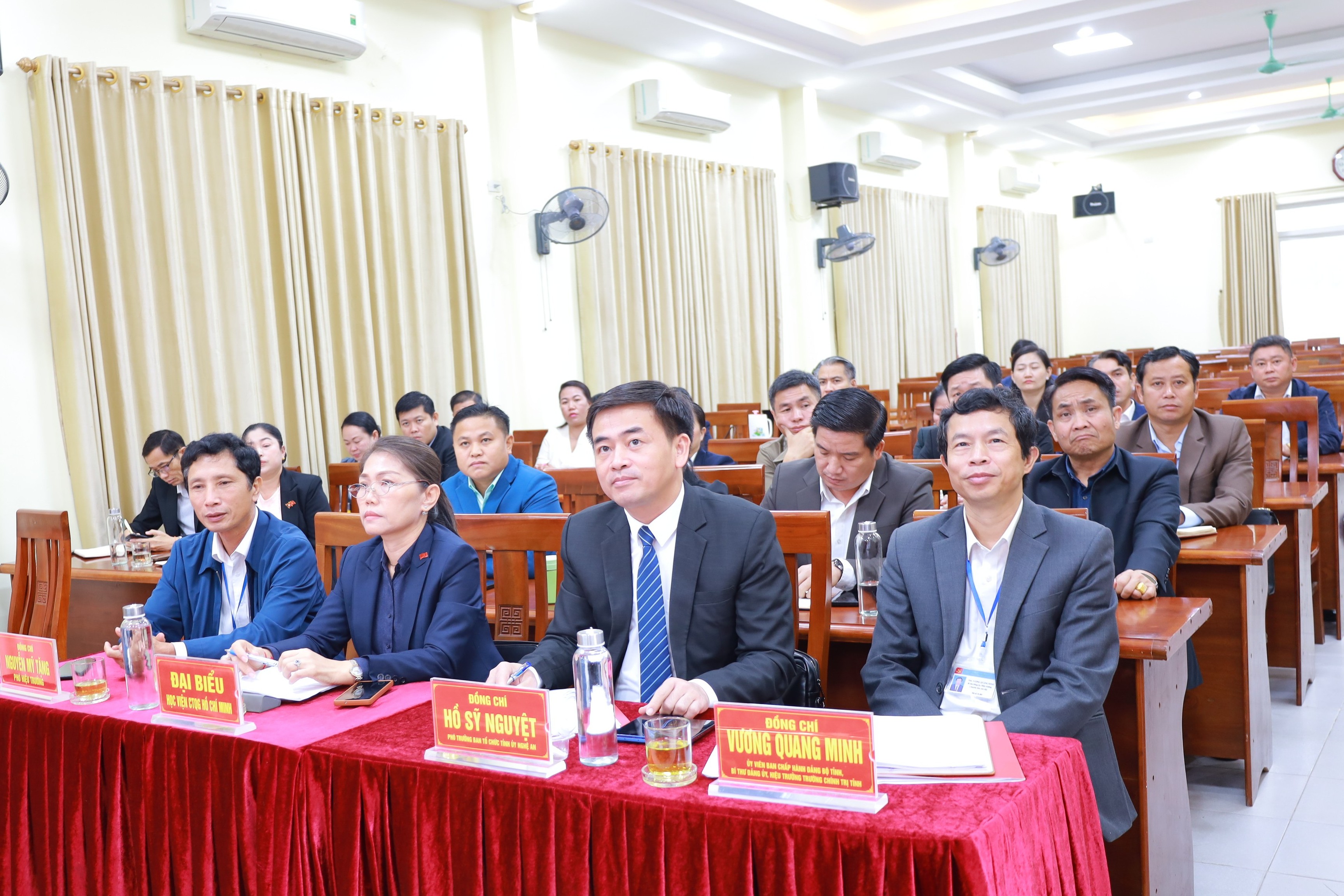 Phát biểu tại chương trình, đồng chí Vương Quang Minh, Tỉnh ủy viên, Bí thư Đảng ủy, Hiệu trưởng Trường Chính trị tỉnh Nghệ An bày tỏ sự vui mừng khi được đồng hành cùng đoàn nghiên cứu thực tế, đồng thời tin tưởng rằng các nội dung chuyên đề sẽ giúp học viên có thêm thông tin bổ ích phục vụ công tác tại cơ sở, góp phần tăng cường mối quan hệ hữu nghị đặc biệt Việt Nam - Lào.