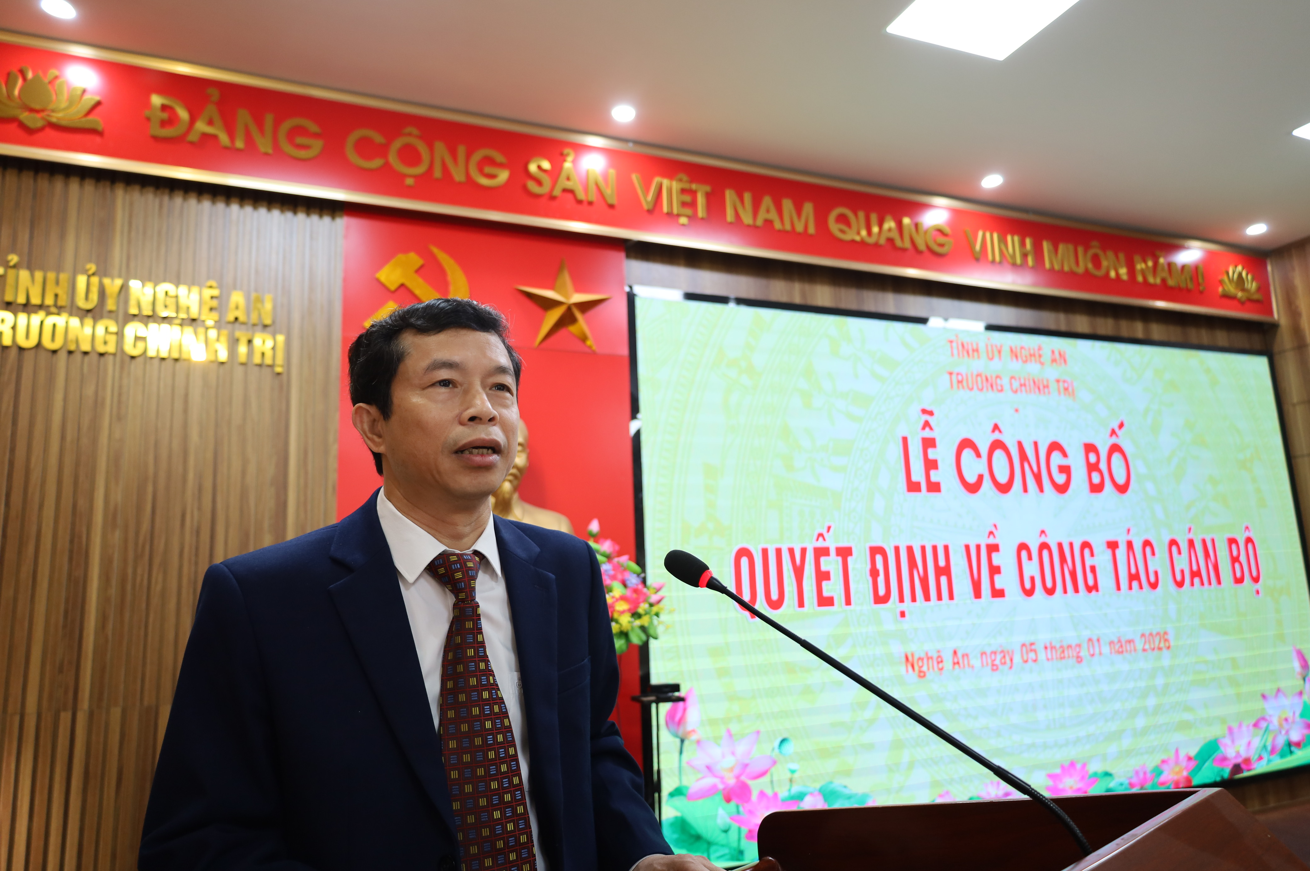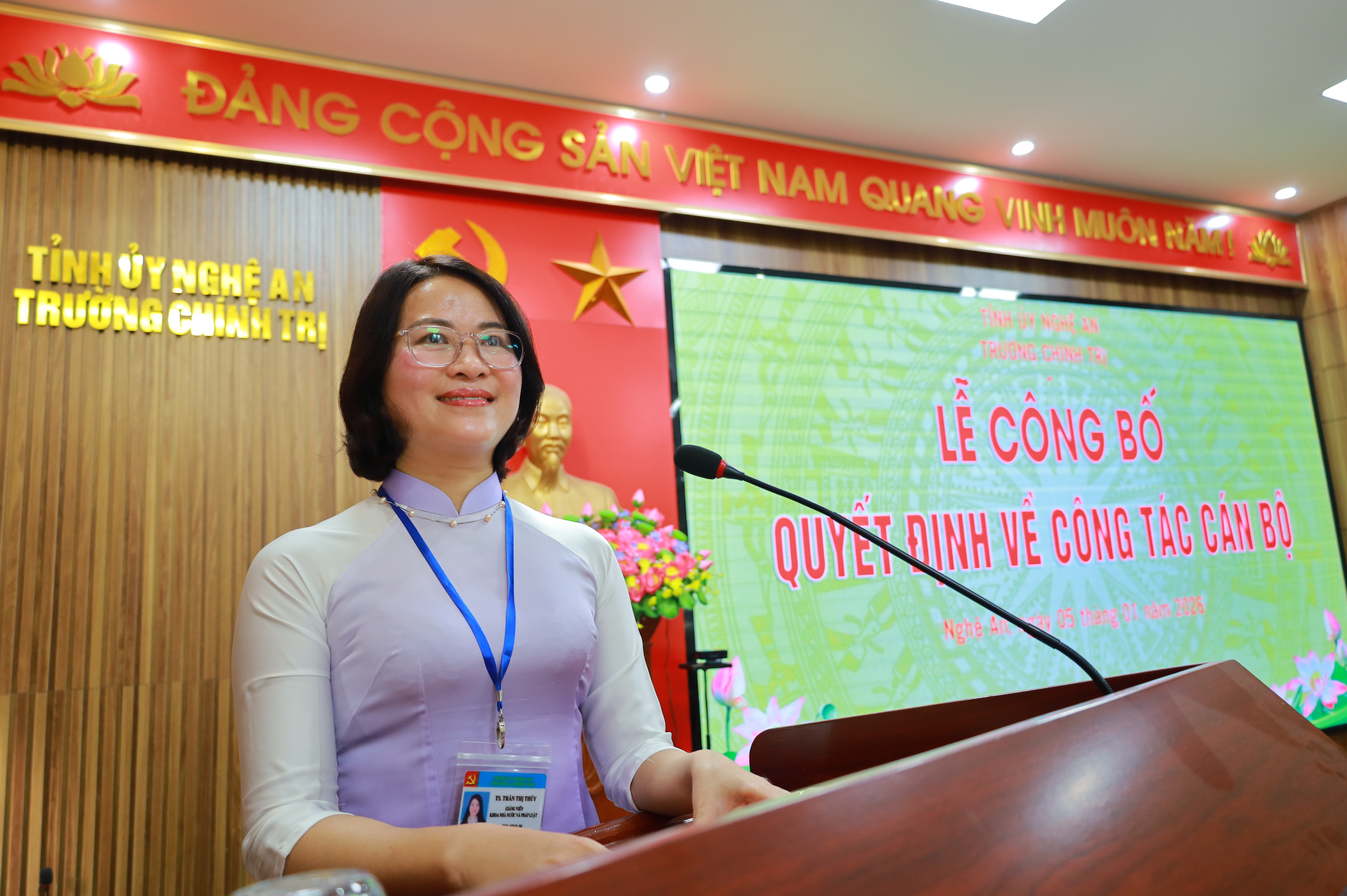 Thừa ủy quyền của Hiệu trưởng Trường Chính trị tỉnh Nghệ An, đồng chí Nguyễn Đình Thanh - Trưởng phòng Tổ chức - Tổng hợp đã công bố Quyết định về việc bổ nhiệm viên chức quản lý đối với đồng chí Trần Thị Thúy - Giảng viên chính khoa Nhà nước và Pháp luật. Theo đó, bổ nhiệm có thời hạn (05 năm) đồng chí Trần Thị Thúy, Giảng viên chính khoa Nhà nước và Pháp luật giữ chức vụ Phó Trưởng khoa Nhà nước và Pháp luật, Trường Chính trị tỉnh Nghệ An.