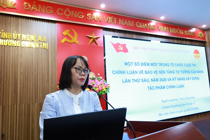 Tại hội nghị, TS Lê Thị Chiến đã trao đổi nhiều nội dung quan trọng liên quan đến công tác bảo vệ nền tảng tư tưởng của Đảng trong bối cảnh hiện nay; làm rõ những yêu cầu, nhiệm vụ đặt ra đối với đội ngũ cán bộ, giảng viên, báo cáo viên trong việc chủ động tham gia đấu tranh phản bác các quan điểm sai trái, thù địch trên không gian mạng và trong đời sống xã hội; giới thiệu một số điểm mới trong tổ chức Cuộc thi chính luận về bảo vệ nền tảng tư tưởng của Đảng lần thứ sáu, năm 2026; hướng dẫn kỹ năng xây dựng tác phẩm chính luận bảo đảm tính khoa học, tính chiến đấu và sức lan tỏa.