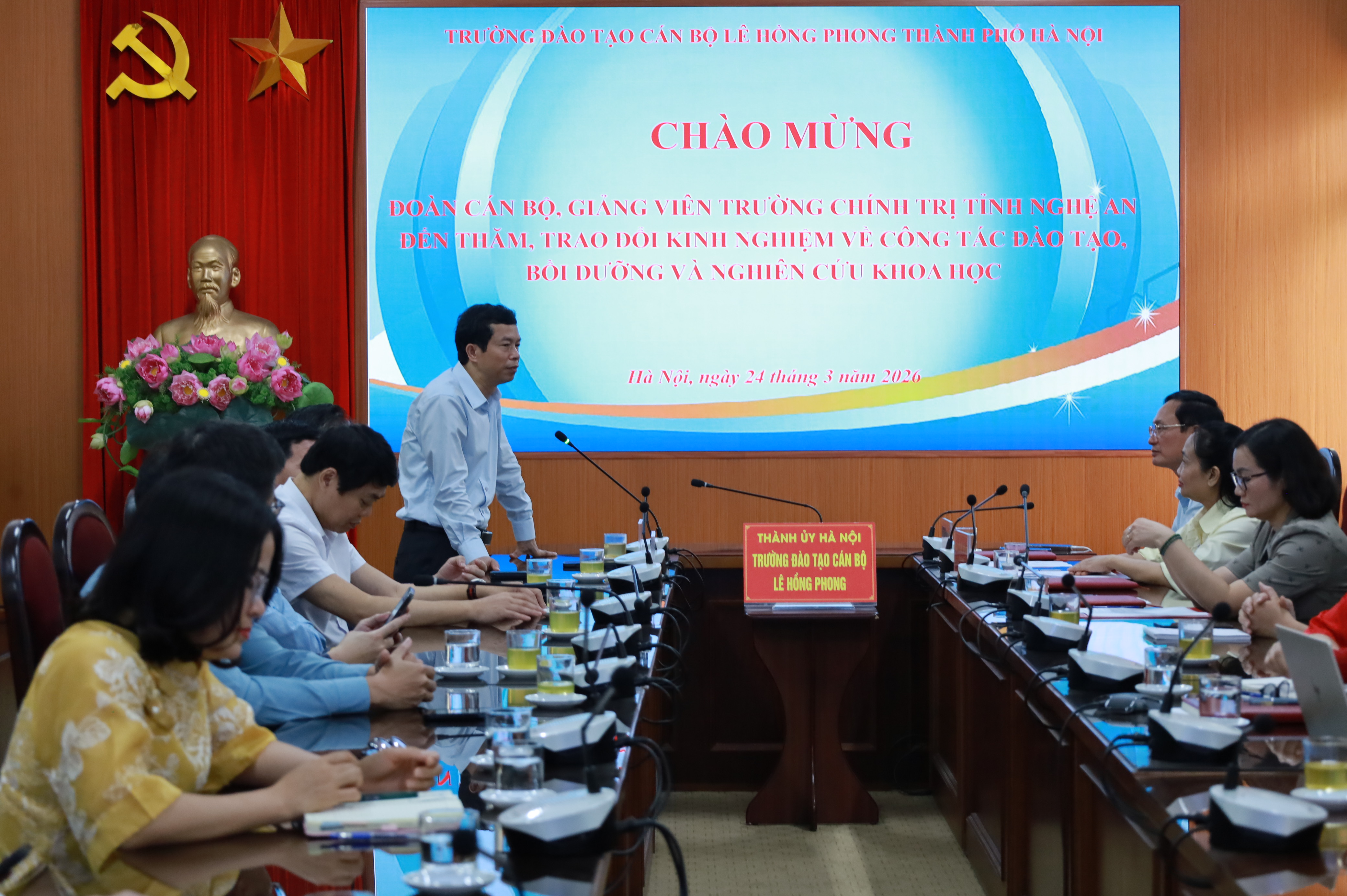 Thực hiện chương trình công tác năm 2026, sáng 24/3, tại Trường Đào tạo cán bộ Lê Hồng Phong (Thành phố Hà Nội), Đoàn công tác Trường Chính trị tỉnh Nghệ An đã có buổi làm việc, trao đổi kinh nghiệm về tổ chức, quản lý đào tạo, bồi dưỡng cán bộ; nghiên cứu khoa học, tổng kết thực tiễn và triển khai chuyển đổi số trong tình hình mới.