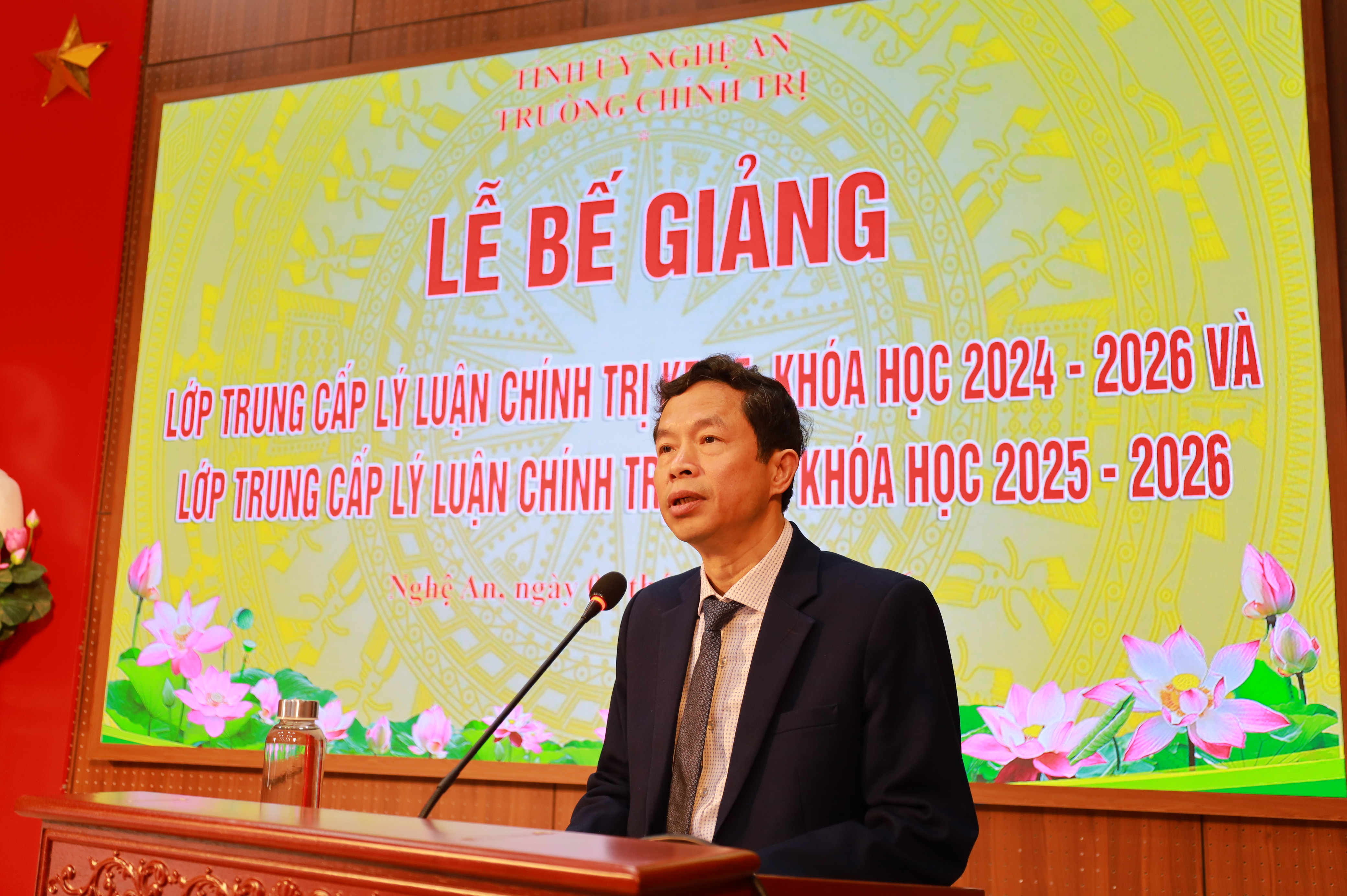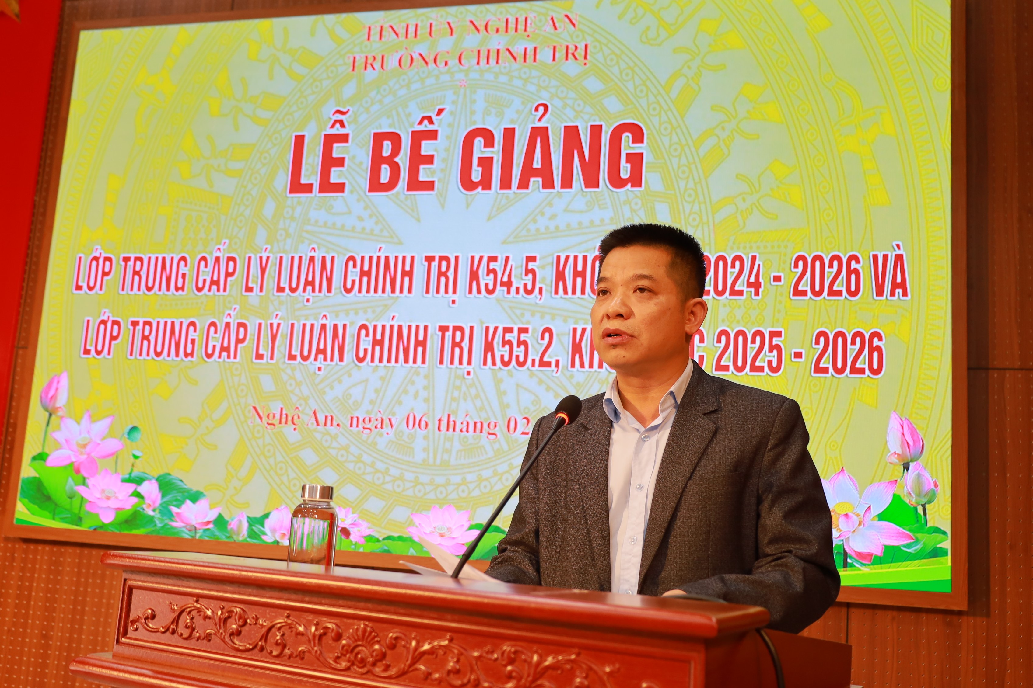 Chiều ngày 06/02/2026, Trường Chính trị tỉnh Nghệ An tổ chức Lễ bế giảng cho 2 lớp Trung cấp lý luận chính trị K54.5, hệ không tập trung, khóa học 2024-2026; K55.2, hệ tập trung, khoá học 2025-2026. Dự Lễ bế giảng có ThS. Vương Quang Minh – Tỉnh ủy viên, Bí thư Đảng uỷ, Hiệu trưởng; các đồng chí trong Ban Giám hiệu, đại diện lãnh đạo các khoa, phòng nhà trường, cùng toàn thể học viên 02 lớp.