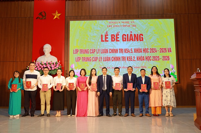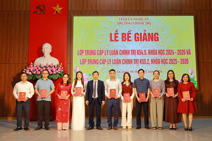 Chiều ngày 06/02/2026, Trường Chính trị tỉnh Nghệ An tổ chức Lễ bế giảng cho 2 lớp Trung cấp lý luận chính trị K54.5, hệ không tập trung, khóa học 2024-2026; K55.2, hệ tập trung, khoá học 2025-2026. Dự Lễ bế giảng có ThS. Vương Quang Minh – Tỉnh ủy viên, Bí thư Đảng uỷ, Hiệu trưởng; các đồng chí trong Ban Giám hiệu, đại diện lãnh đạo các khoa, phòng nhà trường, cùng toàn thể học viên 02 lớp...