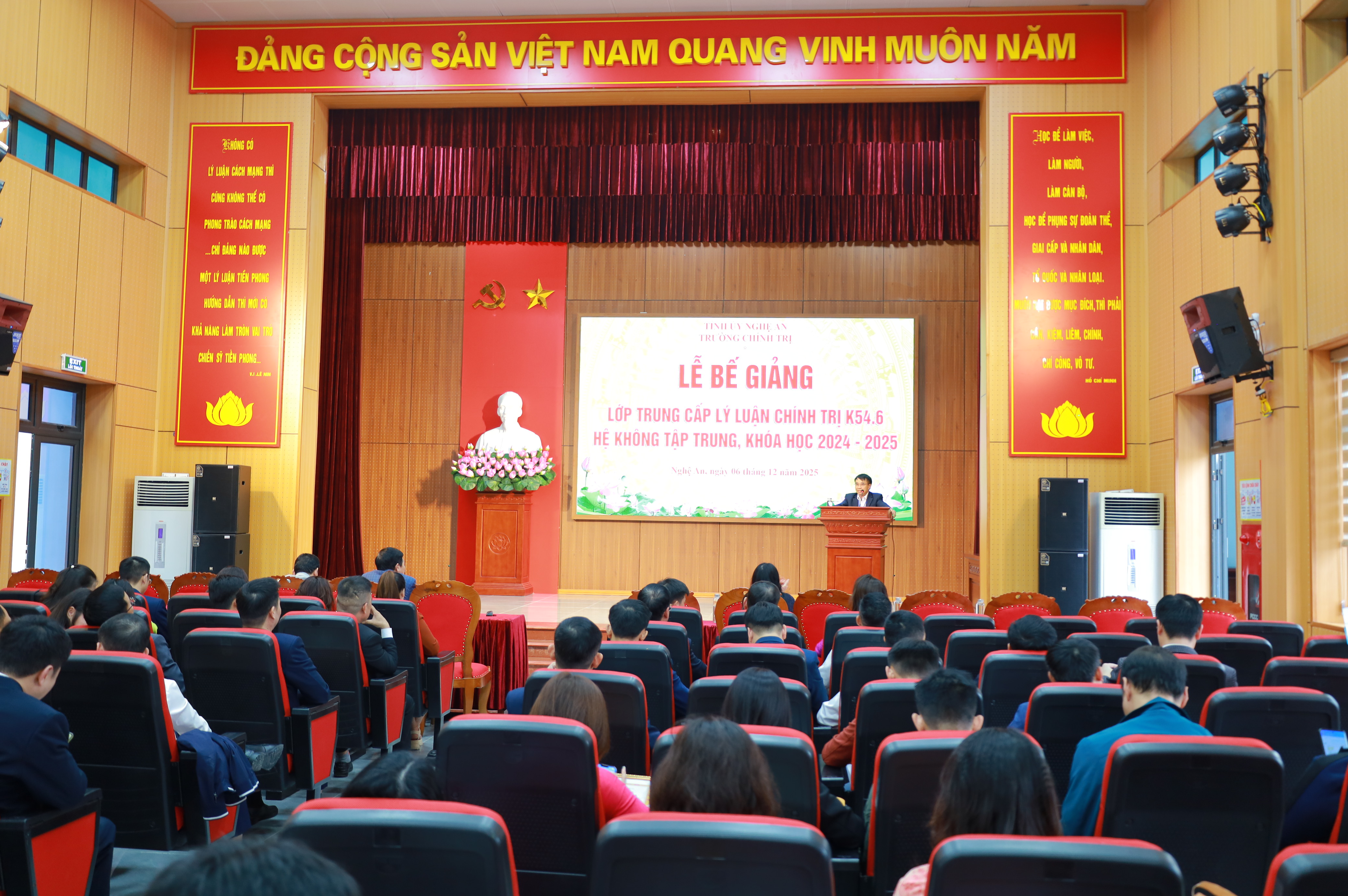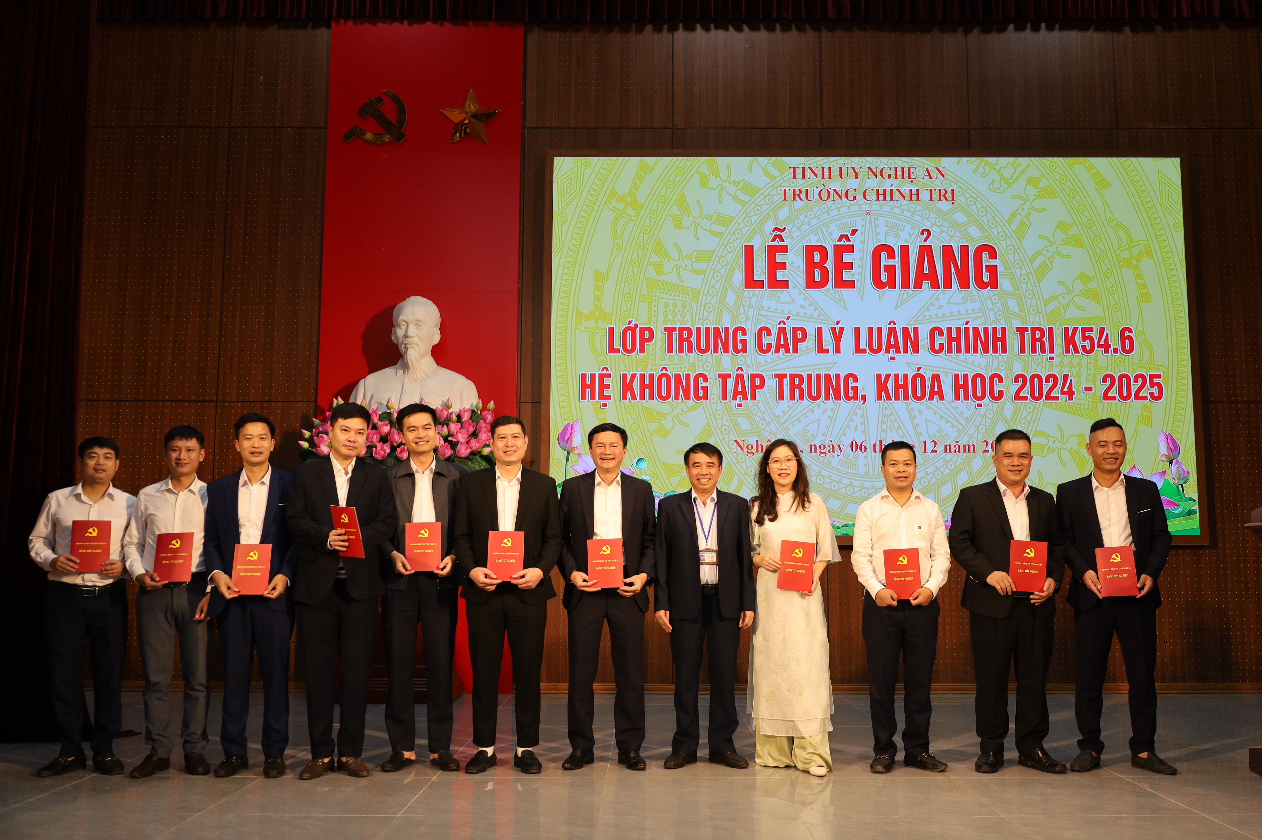 Chiều 06/12/2025, Trường Chính trị tỉnh Nghệ An tổ chức Lễ bế giảng lớp Trung cấp lý luận chính trị K54.6 hệ không tập trung (ngoài giờ hành chính), khóa học 2024 - 2025. Dự Lễ bế giảng có các đồng chí trong Ban Giám hiệu, đại diện lãnh đạo các khoa, phòng nhà trường, cùng toàn thể học viên lớp Trung cấp lý luận chính trị K54.6.